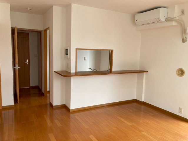 10.5帖のリビングダイニング エアコン、キッチンとつながるカウンター付き、窓際に細めのカウンターがあり、飾り棚にもなります。